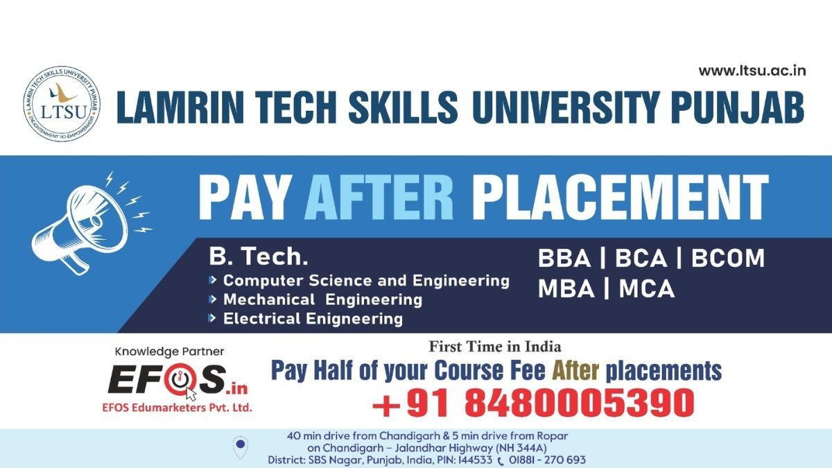रोपड़, पंजाब, भारत: लेमरीन टेक् स्किल्स यूनिवर्सिटी ( Lamrin Tech Skills University ) ने इंजीनियरिंग, प्रबंधन और कंप्यूटर एप्लीकेशन ( B.Tech , BBA, BCA , MBA and MCA ) पाठ्यक्रमों में छात्रों के लिए एक क्रांतिकारी “प्लेसमेंट के बाद भुगतान ( Pay After Placements” कार्यक्रम शुरू करने की घोषणा की है। यह पहल छात्रों की आर्थिक चिंताओं को कम करने और शिक्षा को उनके लिए अधिक सुलभ बनाने की दिशा में एक महत्वपूर्ण कदम है।
