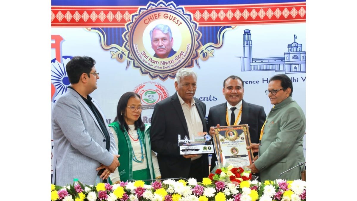 New Delhi [India], November 25: Senior and renowned litterateur, educationist and lyricist Dr. Avnish Rahi, decorated with the honorary degree of Vidya Vachaspati Doctorate of Aligarh, was honoured with the national award “Bharat Vibhushan-2024” by the hands of Delhi Legislative Assembly Speaker Hon’ble Ram Niwas Goyal in the Chief Minister’s Auditorium of Delhi Legislative Assembly, New Delhi. In which the Legislative Assembly Speaker honoured lyricist Dr. Rahi by presenting him with a medal, “Bharat Vibhushan Memorial” and a shawl along with a copper plate.