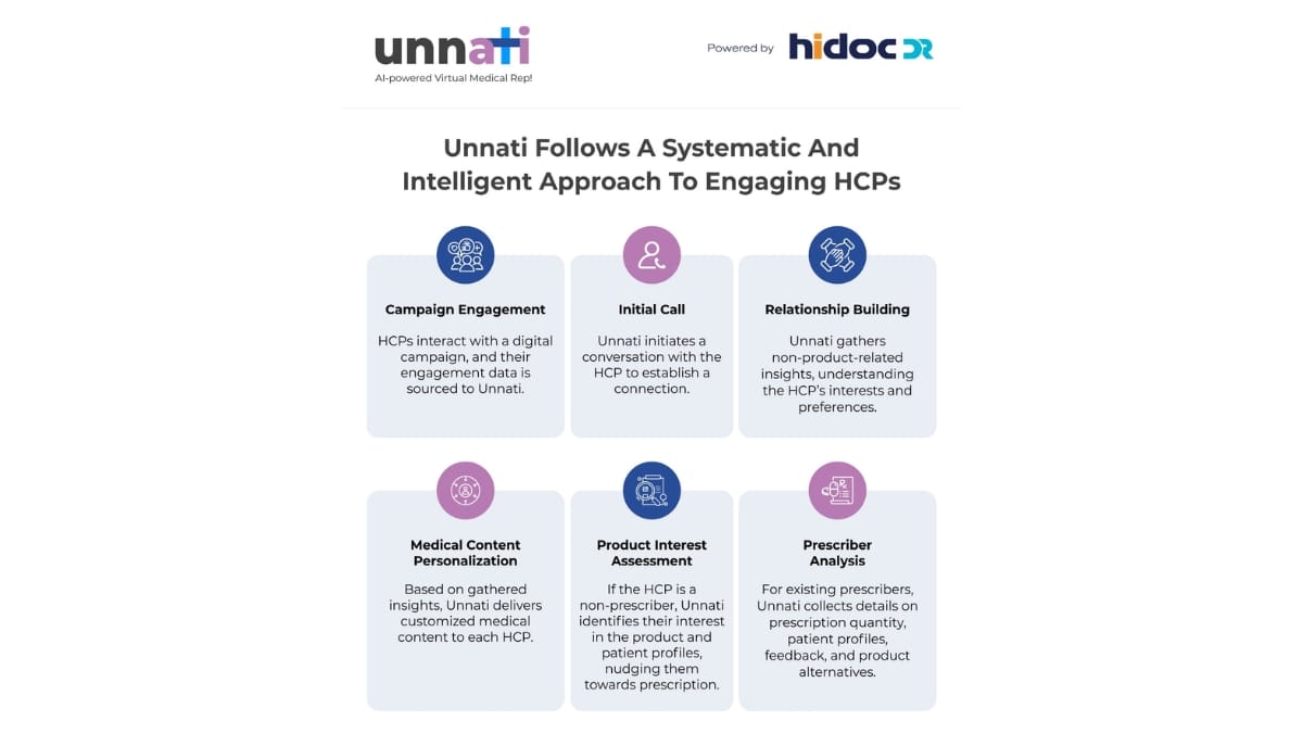 New Delhi [India], July 7: In the dynamic healthcare industry, engaging with healthcare professionals (HCPs) effectively and efficiently remains a critical challenge. Traditional tele-calling services, while functional, often lack the precision and personalization needed to convert engagement into meaningful relationships. Enter Unnati by Hidoc Dr., an innovative AI-powered Virtual Medical Representative (VMR) that is set to transform the way HCPs are engaged, nurtured, and converted into potential leads.